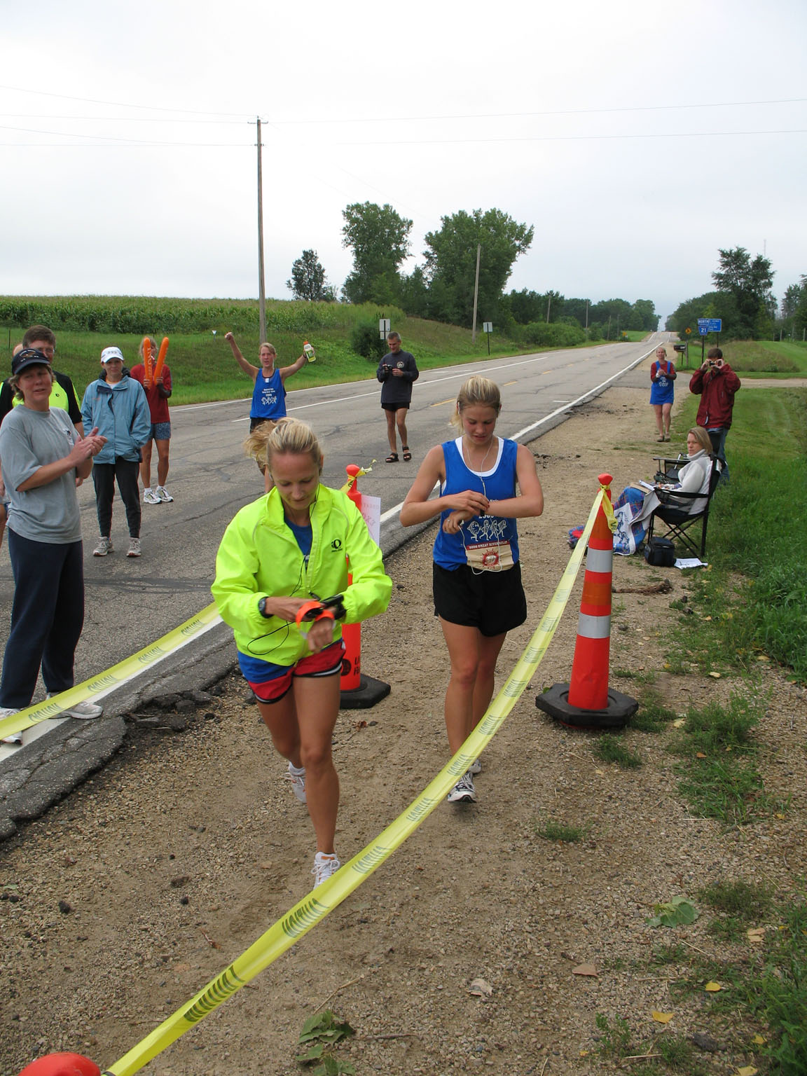 Bill Reinarts looking on, Liz Harper looks relieved to finish her
