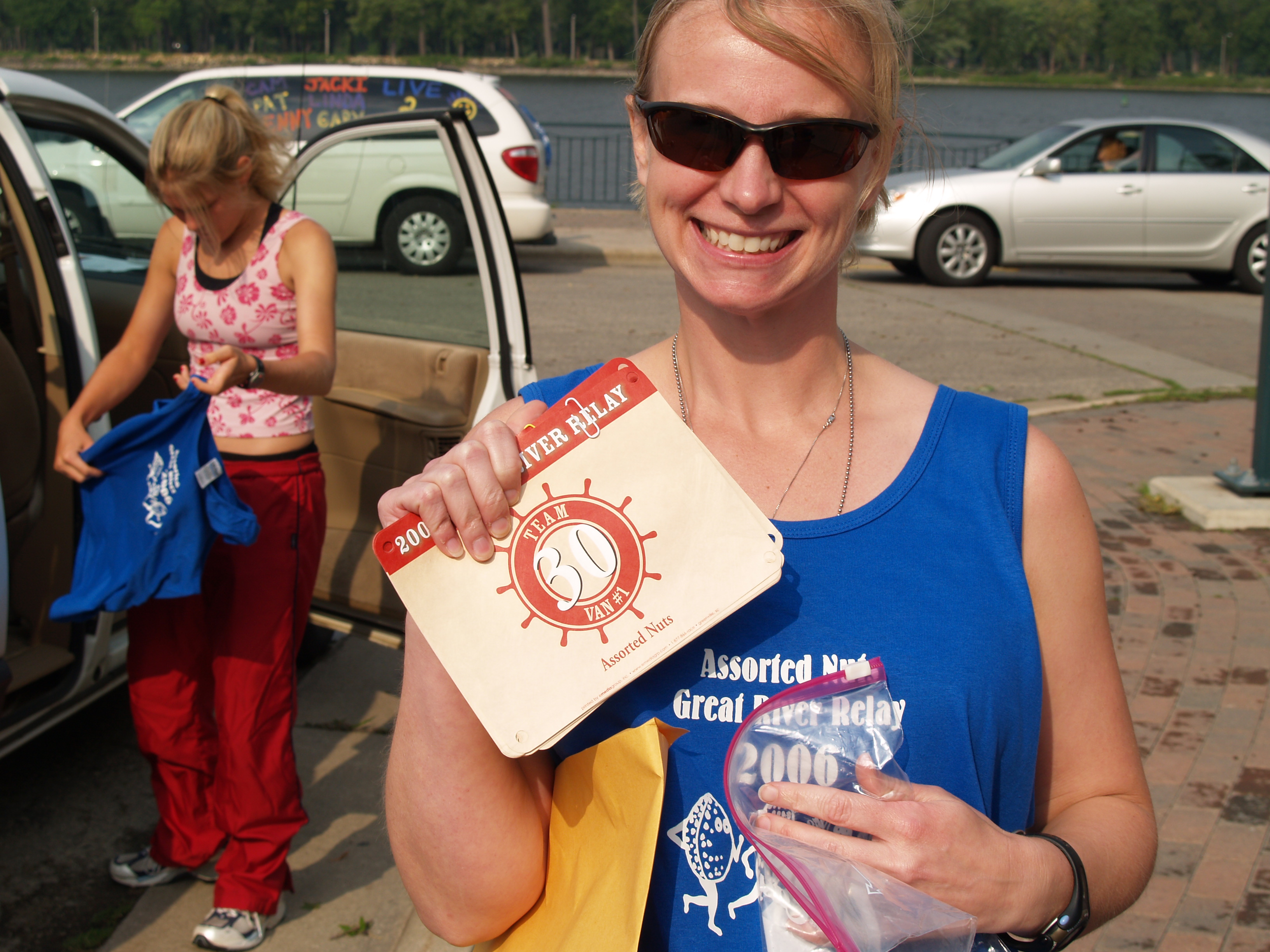 puts on her Assorted Nuts team shirt |