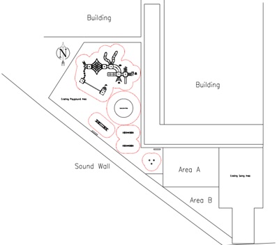 Overall Playground Design - Phase II: Area A is designated as a sports court ; Area B is designated as the fitness station area.